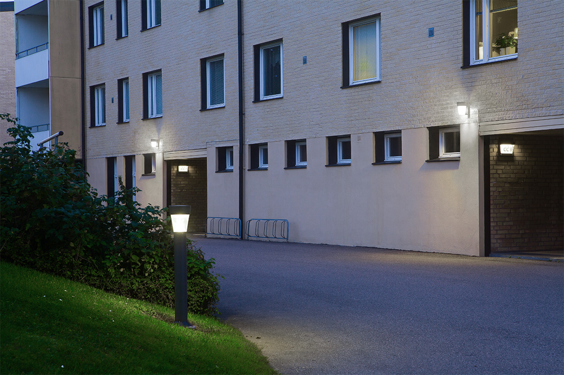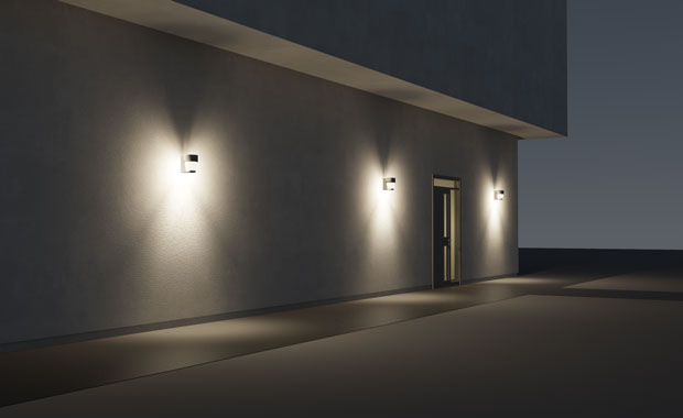 3547 Azur 3547A wall luminaire with a combination of indirect light and opal surfaces that creates a soft yet functional lit accessory to a buildings facade.