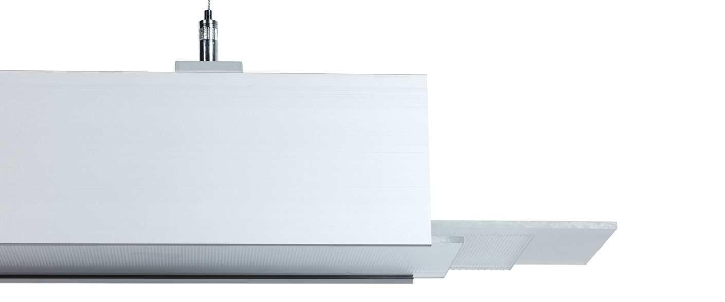 Designed for single or continuous installation via a wire pendent and special loops that give flexible c-c spacing. Special loops included in the delivery. Wires suspension are ordered separately. Can also be wall mounted with special bracket, see Accessories.