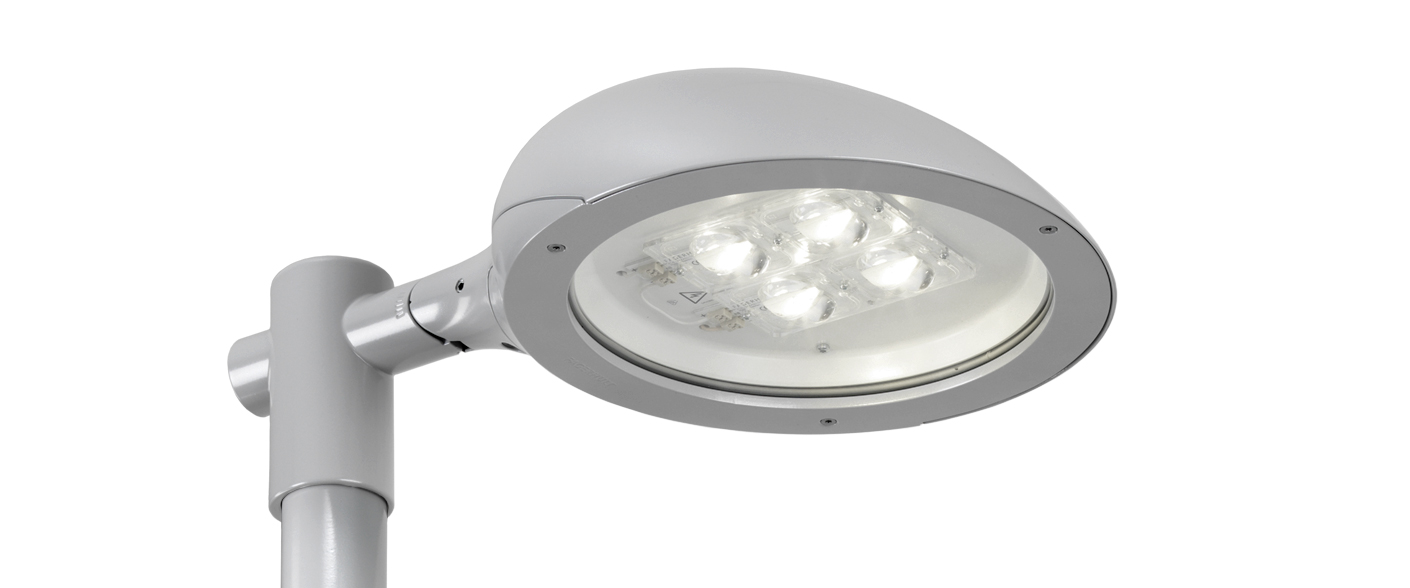 Post top luminaire which in its standard design is mounted on a Ø 60 mm post top. Ø 60 mm post top bracket supplied with luminaire. For other mounting types and other options, see Accessories which are ordered separately. Variable tilting function +10º, -15º for perfect installation. Post height 3–5 m.