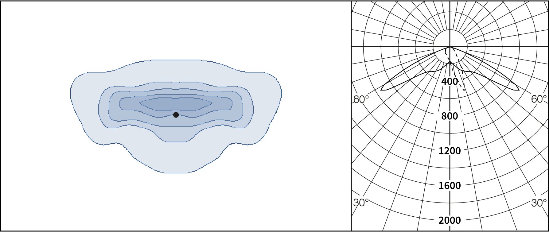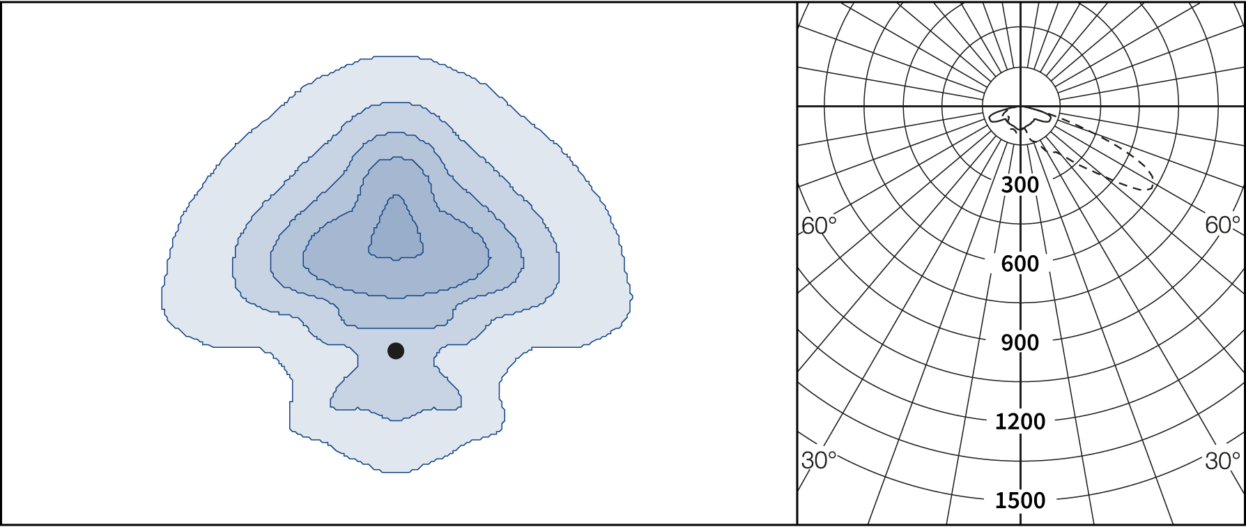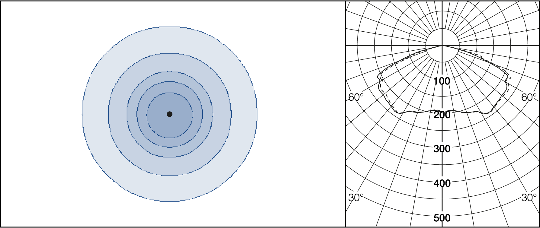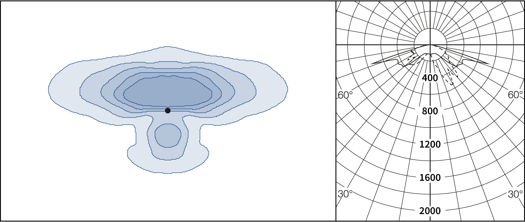 AGC-lenses (Advanced Glare Control). The E-lens are designed to focus on illuminance. L lenses are ideal if the luminance from the ground is the main priority. Plates for backlight screening are available on request.