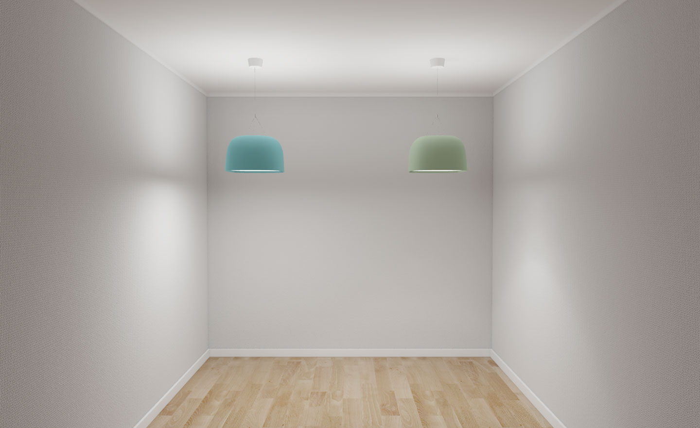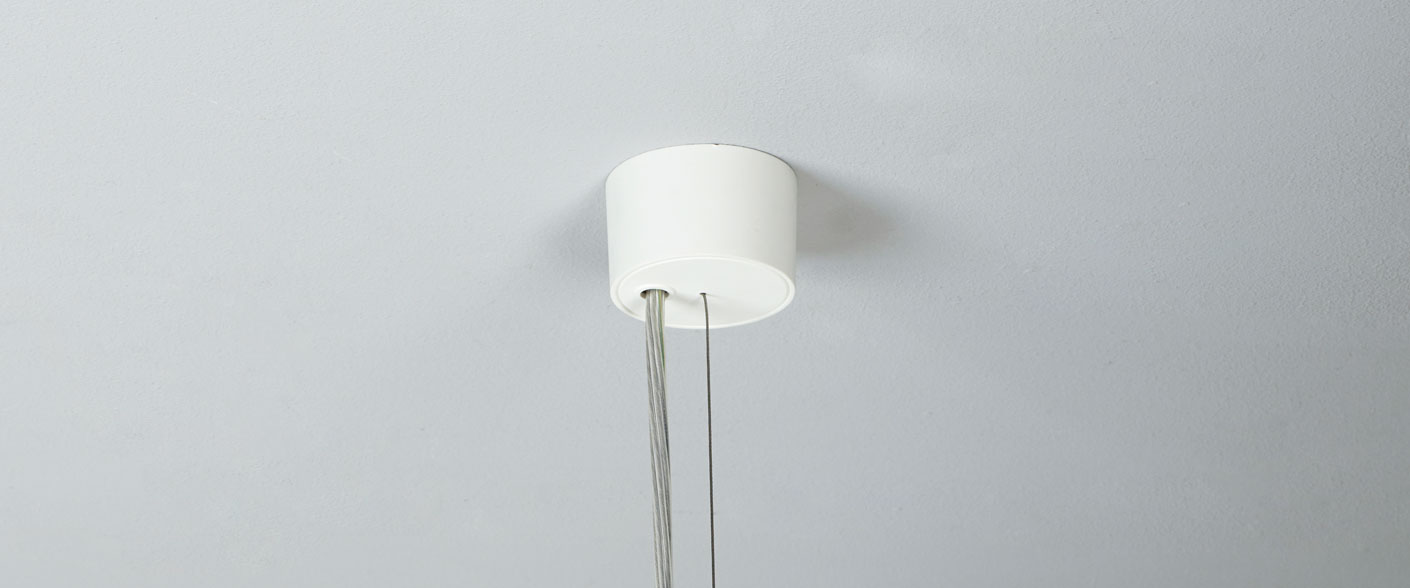Luminaire body in plastic enamelled in various colours. Supplied with 4 m wire, 2,8 m transparent cable and white, plastic ceiling cup. Height adjustment is done on the luminaire using a friction lock. The ceiling cup handles inclined ceilings up to 20°.
