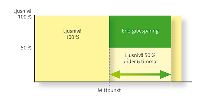 Systemet tilbyder op til 5 fleksible lysniveauer som kan indstilles til valgfri tider. Dette muliggør meget lave lysniveauer om natten, højere lysniveauer når det er nødvendigt og middelhøje niveauer i overgangsperioder. Systemet arbejder udfra et midtpunkt som baseres på den totale tid armaturet skal være tændt. Energibesparelse: afhænger af lysniveau og tid.