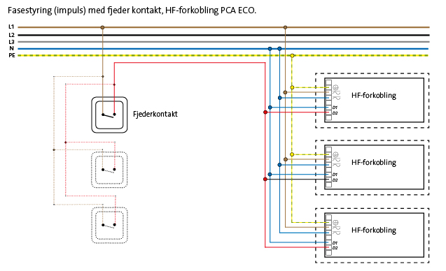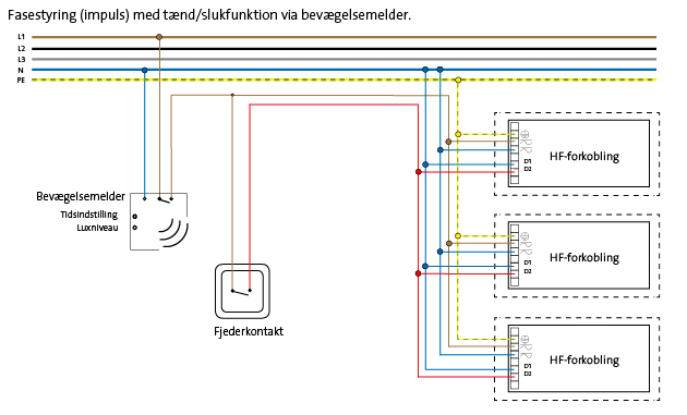 Der skal anvendes fjederkontakt uden glimlampe. Antallet af forkoblinger varierer afhængig af fabrikat. Der skal anvendes samme fase til styrekredsen og strømforsyning til HF-forkoblingen.Ønskes flere HF forkoblinger eller mere avanceret styring, kontakt Fagerhult.
