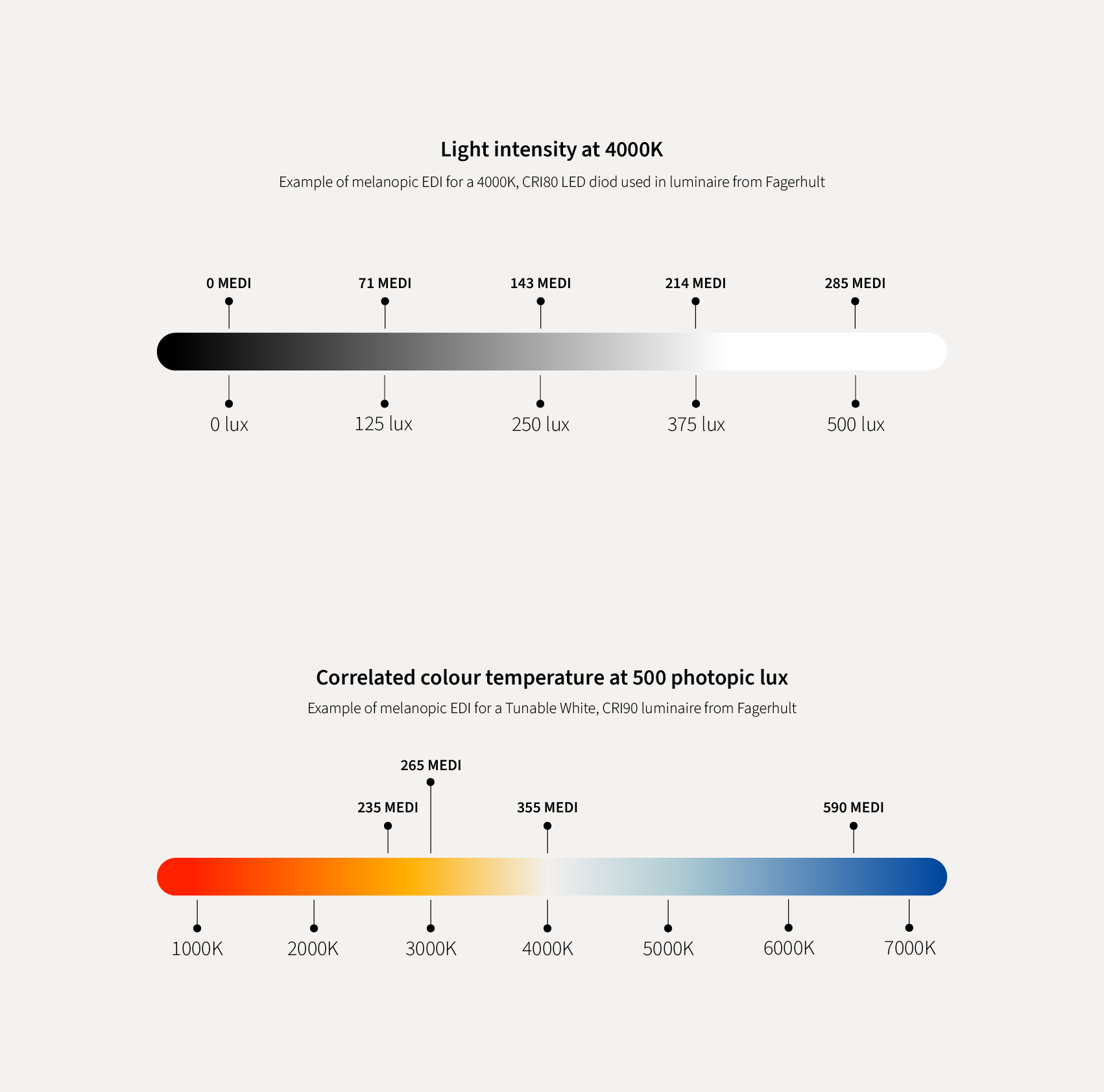 When you know the luminaire's Melanopic Ratio, it becomes easy to calculate the lighting installation's melanopic light intensity. This makes it possible to create a lighting installation that meets both our photopic (visual) light intensity and melanopic (biological) light intensity needs. Melanopic lux is calculated by multiplying the lighting installation's photopic light intensity by the luminaire's Melanopic Ratio (MDER). The value to be achieved is called Melanopic Equivalent Daylight Illuminance (MEDI) and corresponds to a recommended value of 250 lux vertically to the eye. A luminaire with a lower Melanopic Ratio requires higher photopic light intensity to achieve desired levels, and vice versa. Luminaires with light sources of high intensity and higher colour temperature often have a higher Melanopic Ratio.