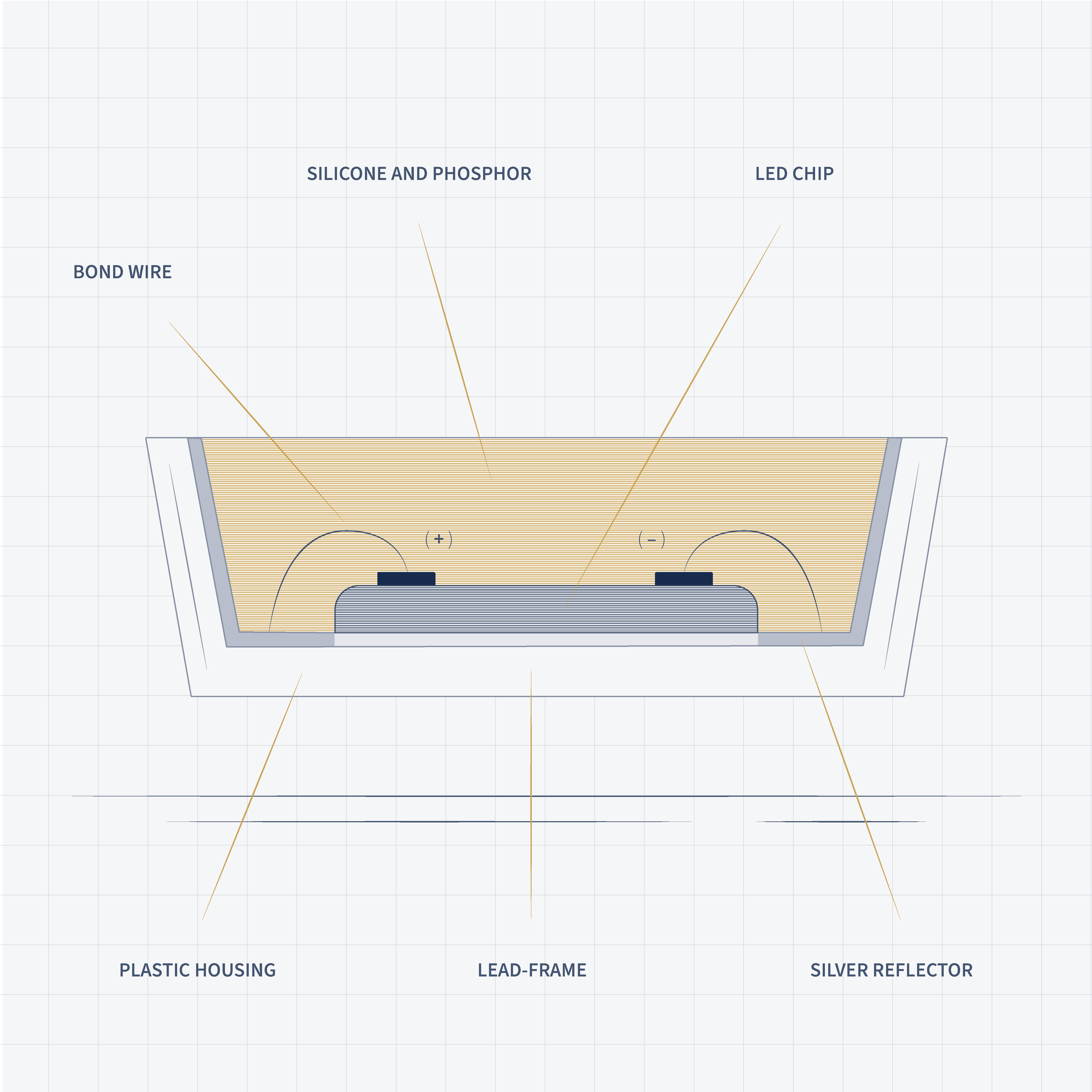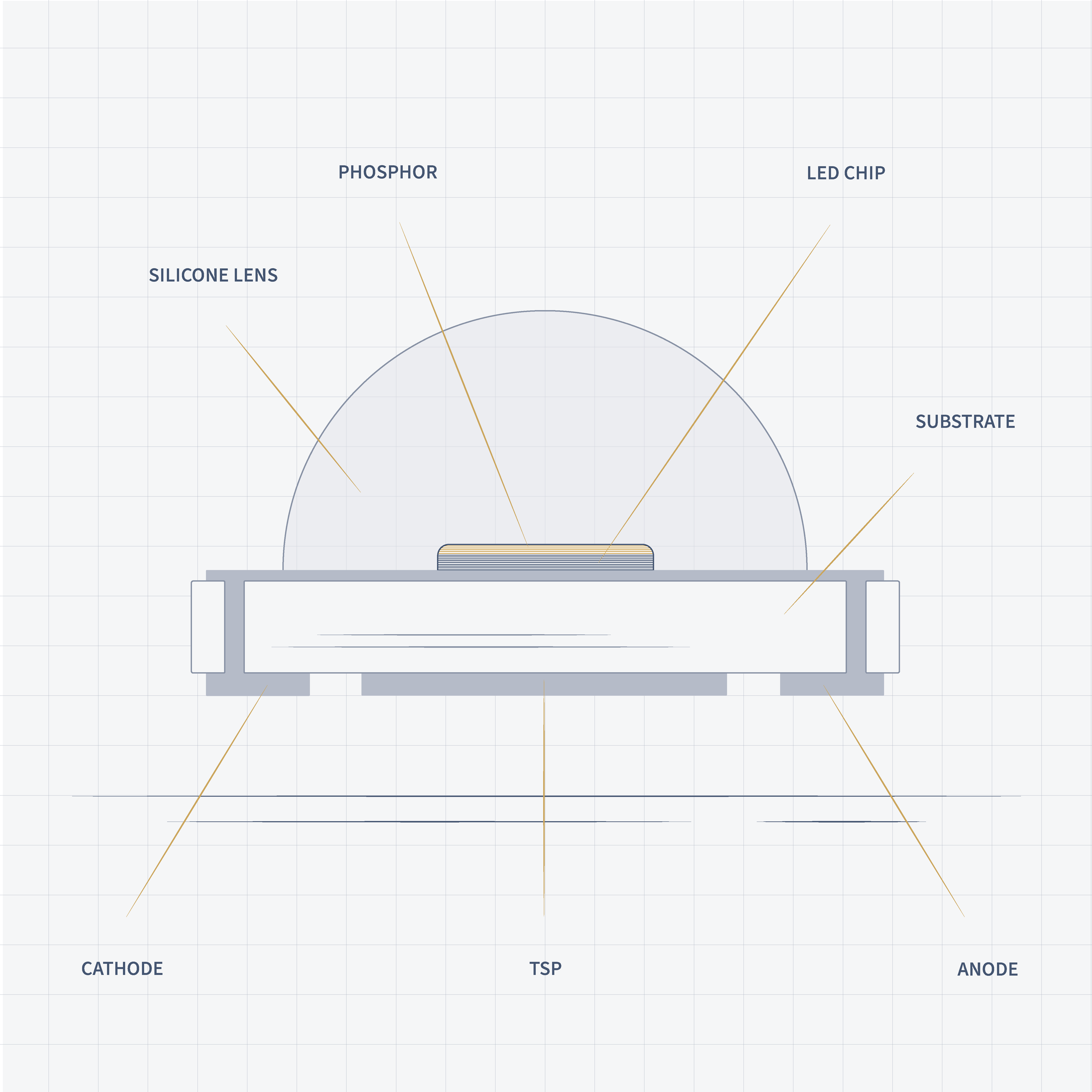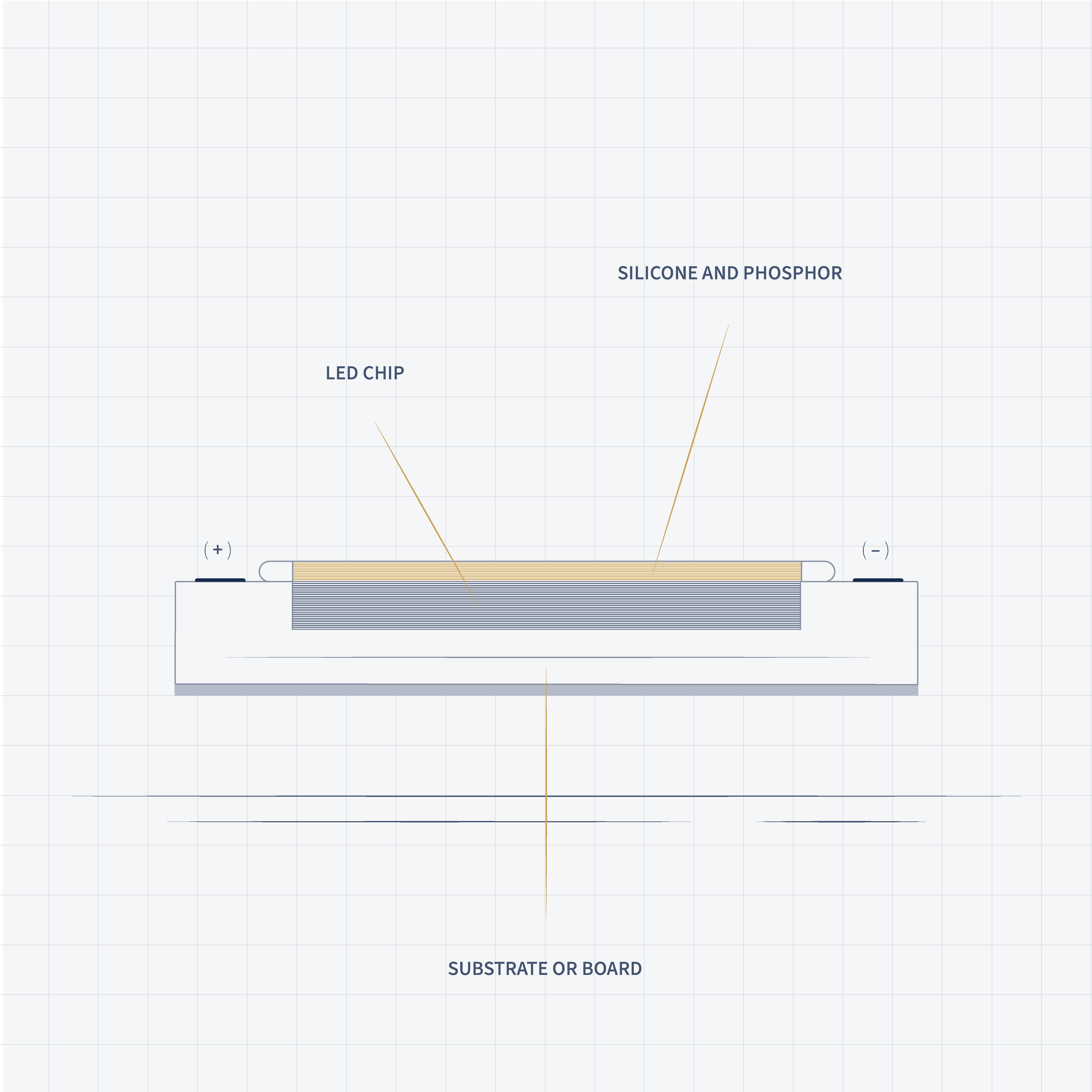 All white LEDs have a chip as their base. When electrically stimulated, it emits blue light. The chip is covered in phosphor mixed with silicone, which converts the blue light into white light. The composition of the phosphor determines the colour temperature and colour rendering of the LED. LEDs are divided into types according to how they are constructed. They have different properties and are suitable for different applications and luminaire types.