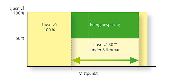 Systemet beregner midtpunktet for den lyssyklusen anlegget er tent og regulerer deretter ned fra 100 prosent til 50 prosent i 6 timer fra midtpunktet. Når 6 timer er gått, reguleres anlegget opp igjen til 100 prosent.
